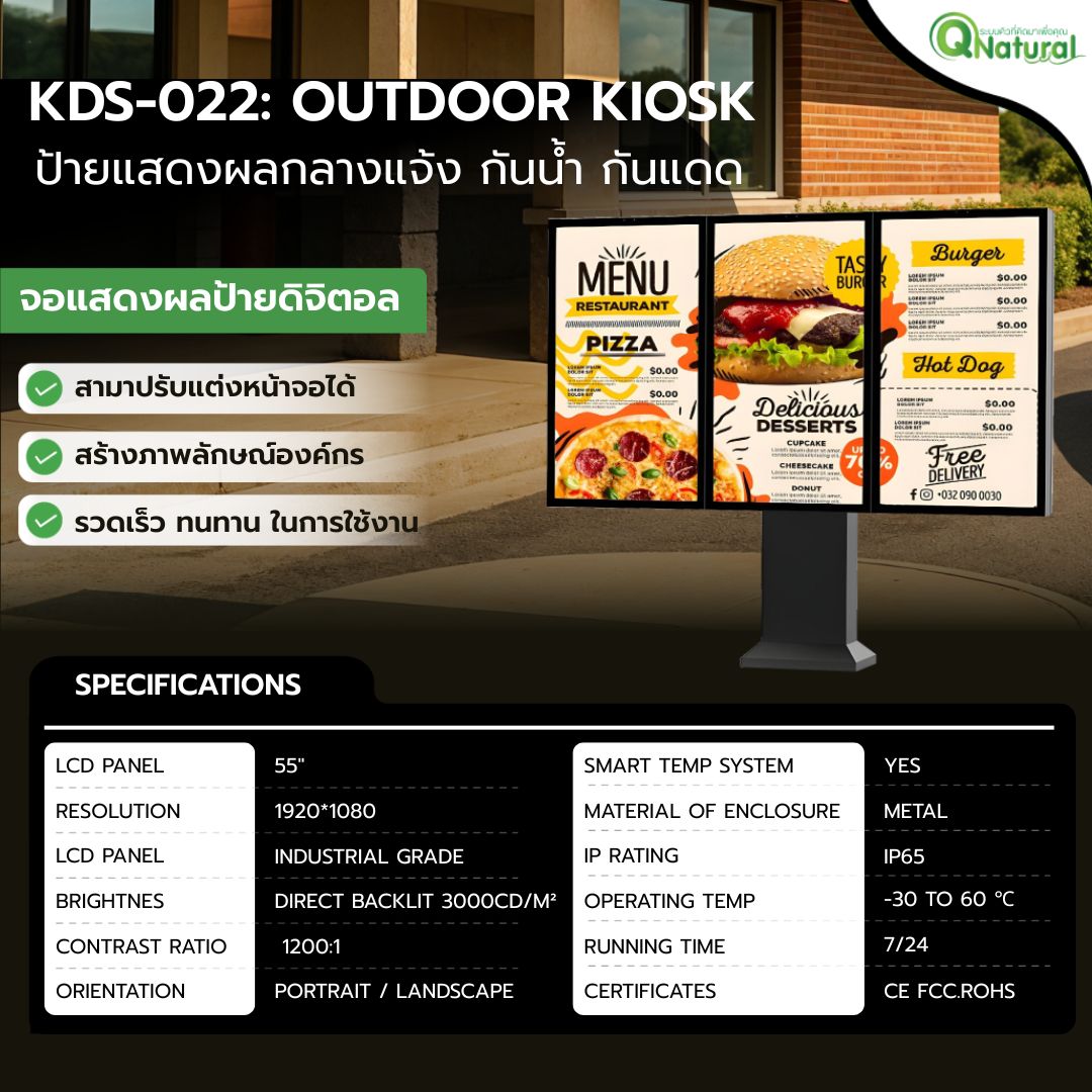 ยกระดับประสบการณ์ลูกค้าและเพิ่มยอดขายให้ธุรกิจของคุณด้วย KDS-022: Outdoor Kiosk โซลูชันป้ายโฆษณาดิจิตอล (Digital Signage) สำหรับการใช้งานกลางแจ้งโดยเฉพาะ ออกแบบมาเพื่อทนทานต่อทุกสภาพอากาศในประเทศไทย ไม่ว่าจะเป็นแดดจัดหรือฝนตกหนัก พร้อมแสดงผลคอนเทนต์ได้อย่างคมชัด สดใส ดึงดูดทุกสายตา เหมาะสำหรับสร้างป้ายเมนู Drive-Thru ที่ทันสมัย, ป้ายโปรโมชั่นหน้าร้าน หรือสื่อประชาสัมพันธ์ในพื้นที่สาธารณะ
